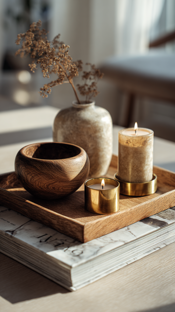 2) Couchtisch-Tray: Kerzen + Naturschale