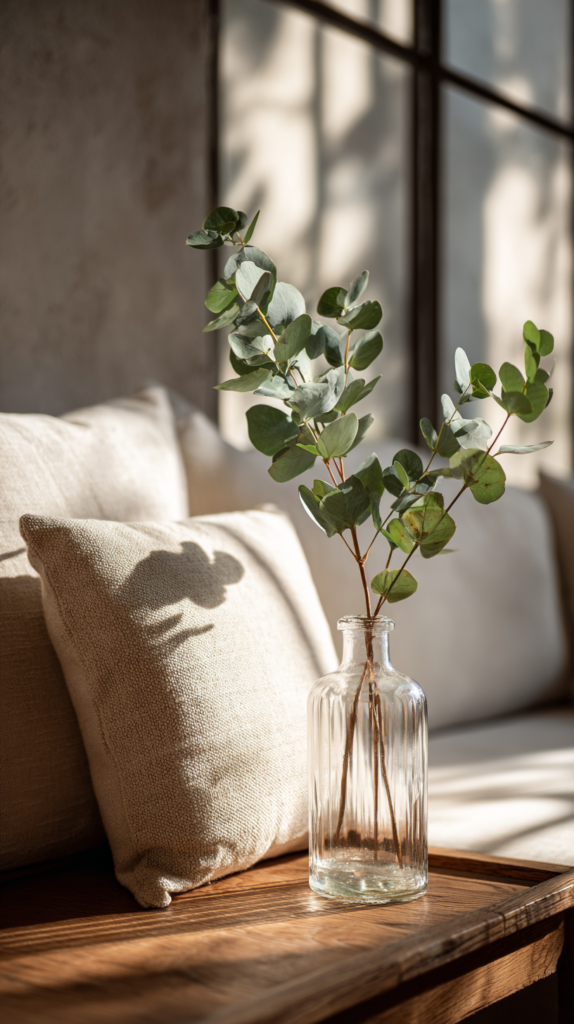 1. Glaszylinder wählen, 1–2 Birken- oder Eukalyptusäste einstellen.