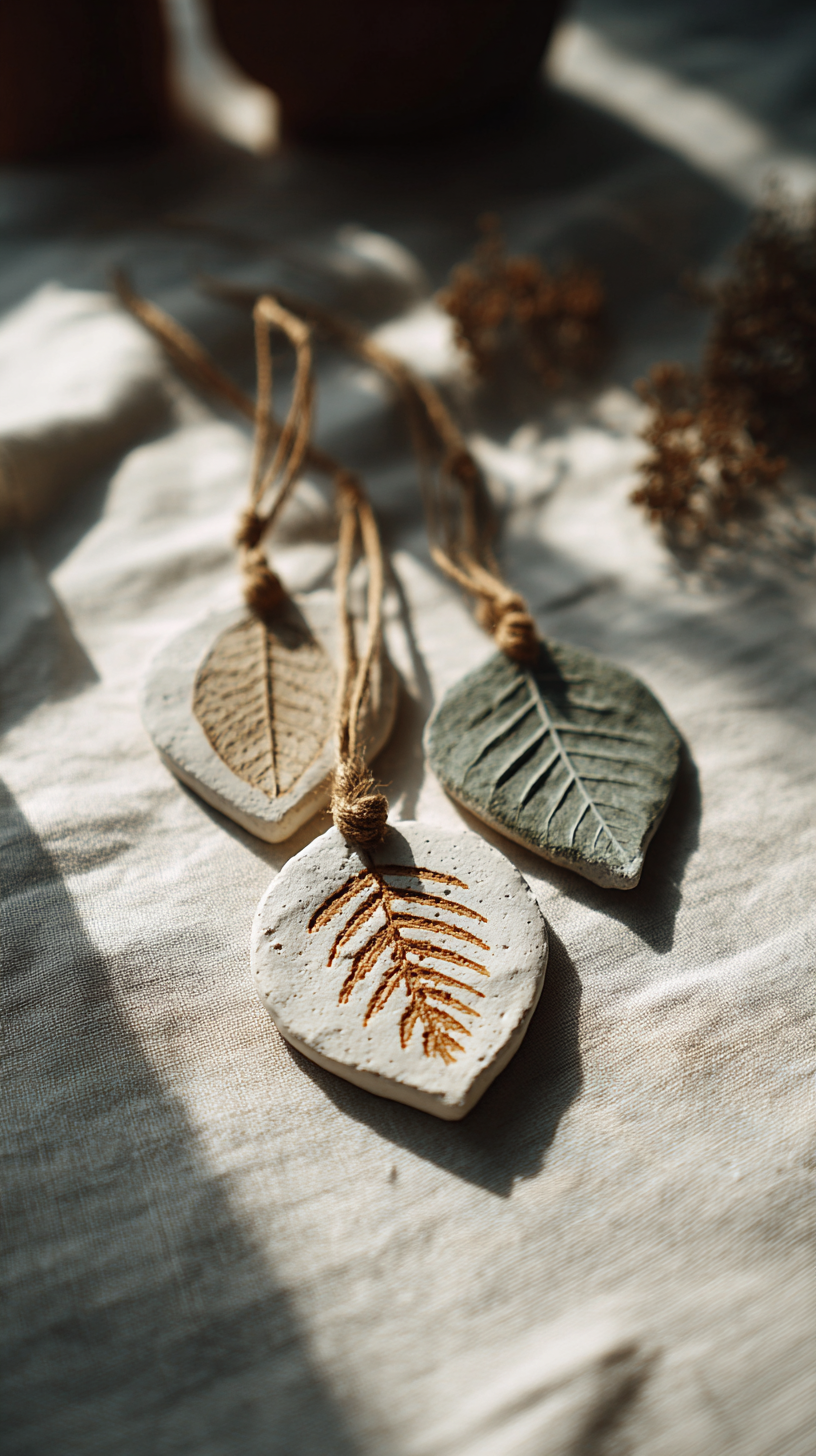 7) Blatt-Abdrücke in Lufttrockenton (Anhänger/Platzkarten)