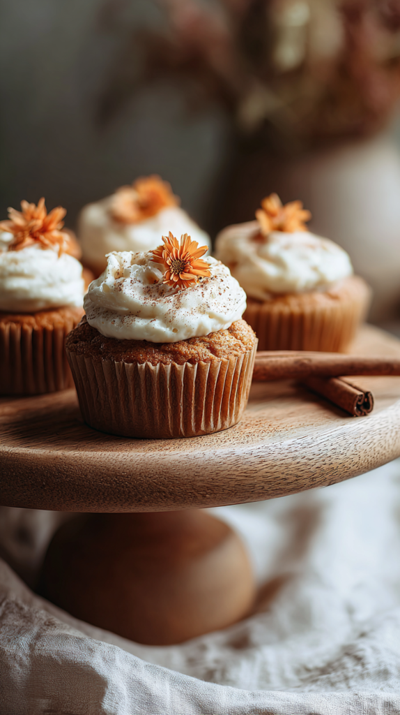 Auch Food wird zum Deko-Highlight: Boho Baby Shower Ideas Girl sind kleine Kürbis-Cupcakes mit Zimt-Frosting.