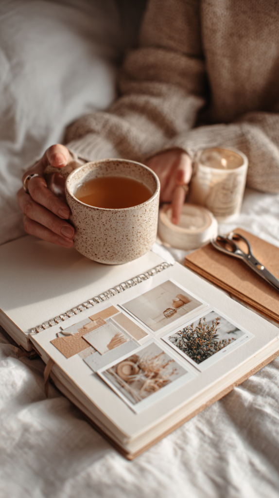 Speicher dir 6 Bilder: warmes Frühstück, ruhige Haut, Spaziergang, aufgeräumte Ecke, Tee, weiches Licht.