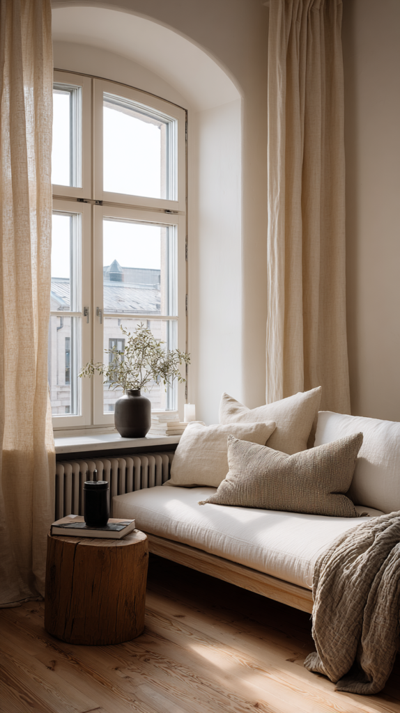 Natürliches Licht ist ein zentraler Bestandteil der skandinavischen Einrichtung. Verzichte auf schwere Vorhänge und nutze stattdessen leichte Leinen- oder Baumwollstoffe. Große Fenster lassen den Raum offener wirken. Wenn du wenig Licht hast: setze auf Spiegel, die das Tageslicht reflektieren.