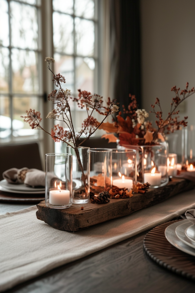 9) „Kerzen auf einer Holzscheibe“ (rustikal, aber modern)