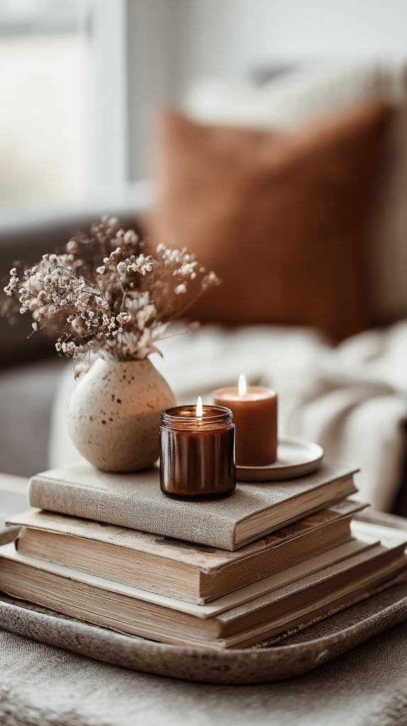 Bücher, alte Kerzenhalter oder kleine Fundstücke aus dem Flohmarkt machen dein Wohnzimmer persönlich und einzigartig. So wirkt der Boho Vintage Look nie steril.