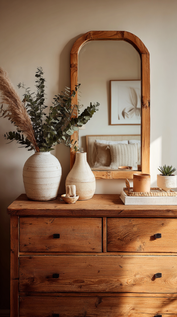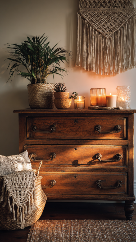 Eine alte Kommode mit Patina oder Holzdetails sorgt für Charakter. Mit Boho-Deko wie Kerzen, Makramee oder Pflanzen kombiniert, wird sie zum Hingucker.
