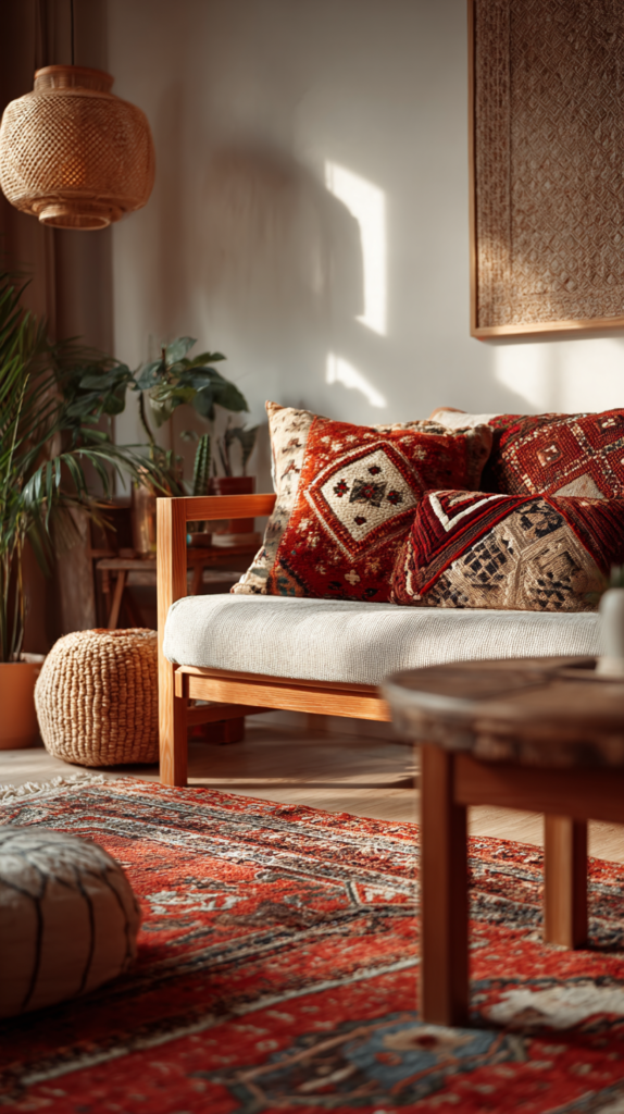 Textilien sind die einfachste Möglichkeit, Boho ins Wohnzimmer zu bringen. Kissen mit Mustern, Quasten oder Erdtönen passen perfekt zu Vintage-Möbeln.