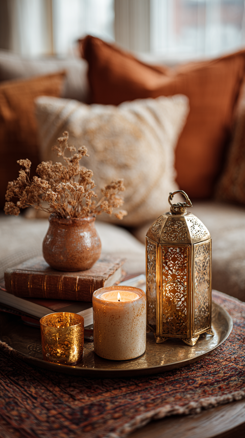 Nichts schafft so viel Stimmung wie Kerzen. Besonders schön: Laternen im Vintage-Stil oder Kerzenhalter in Messing kombiniert mit Boho-Deko.